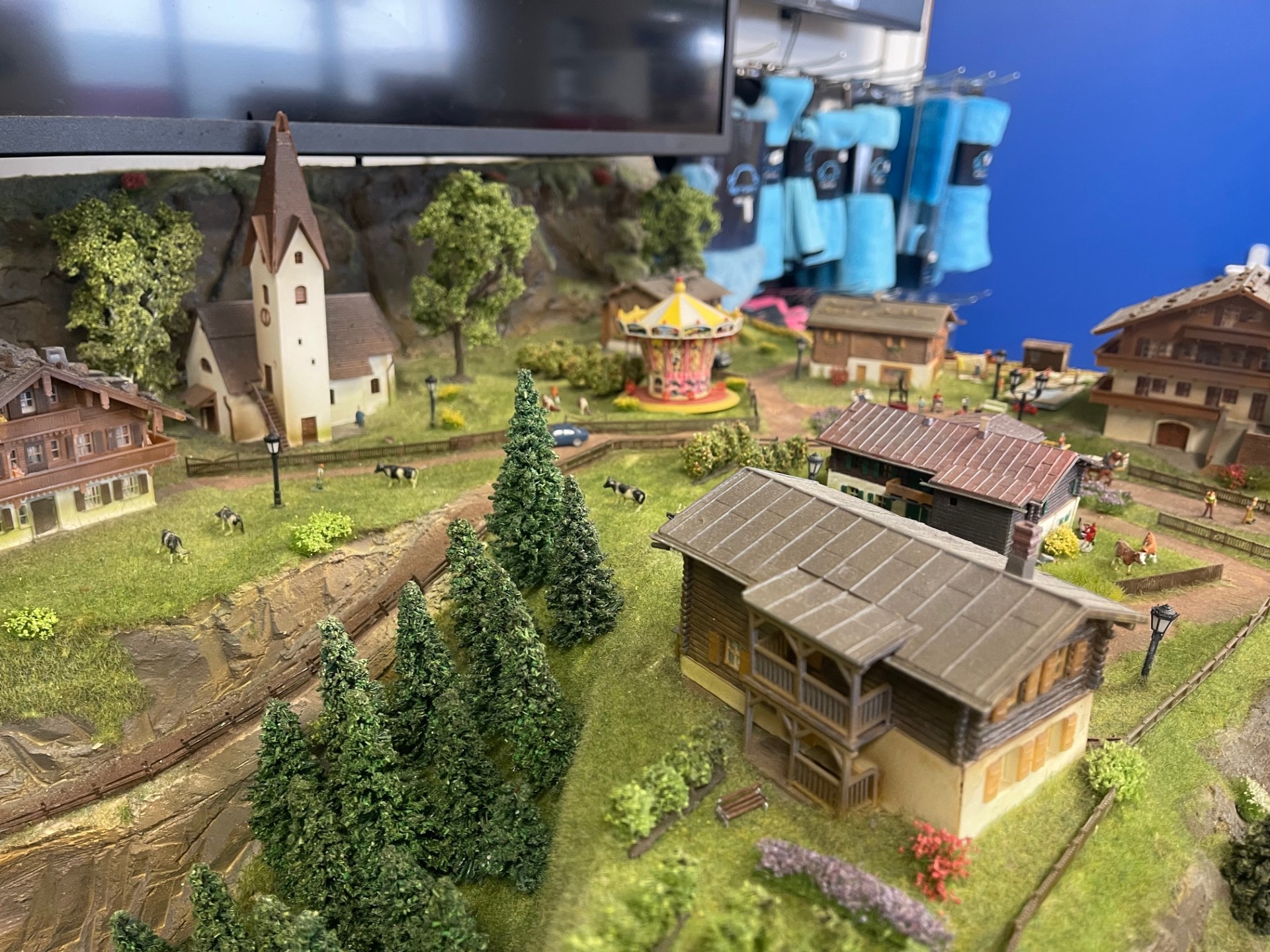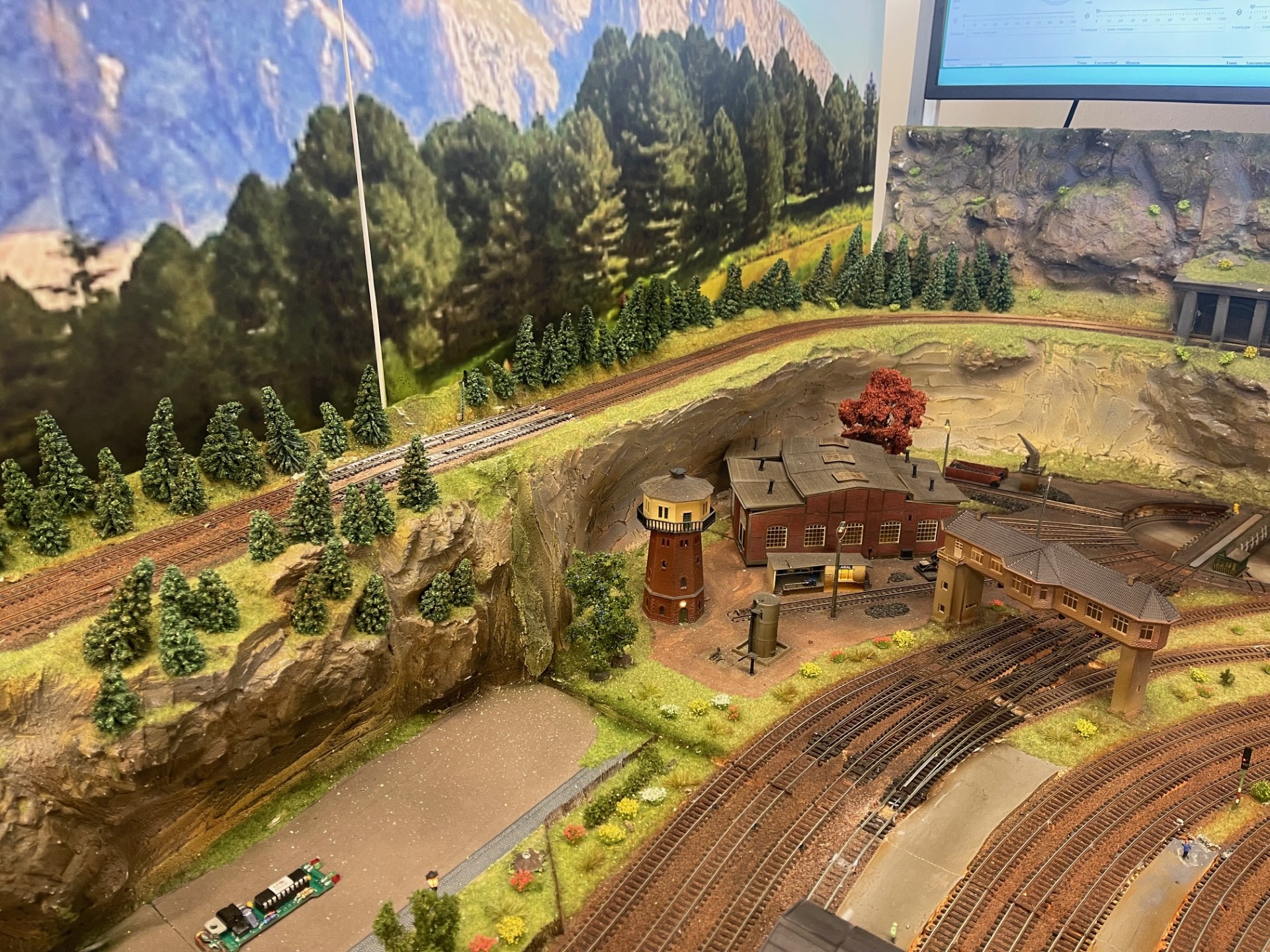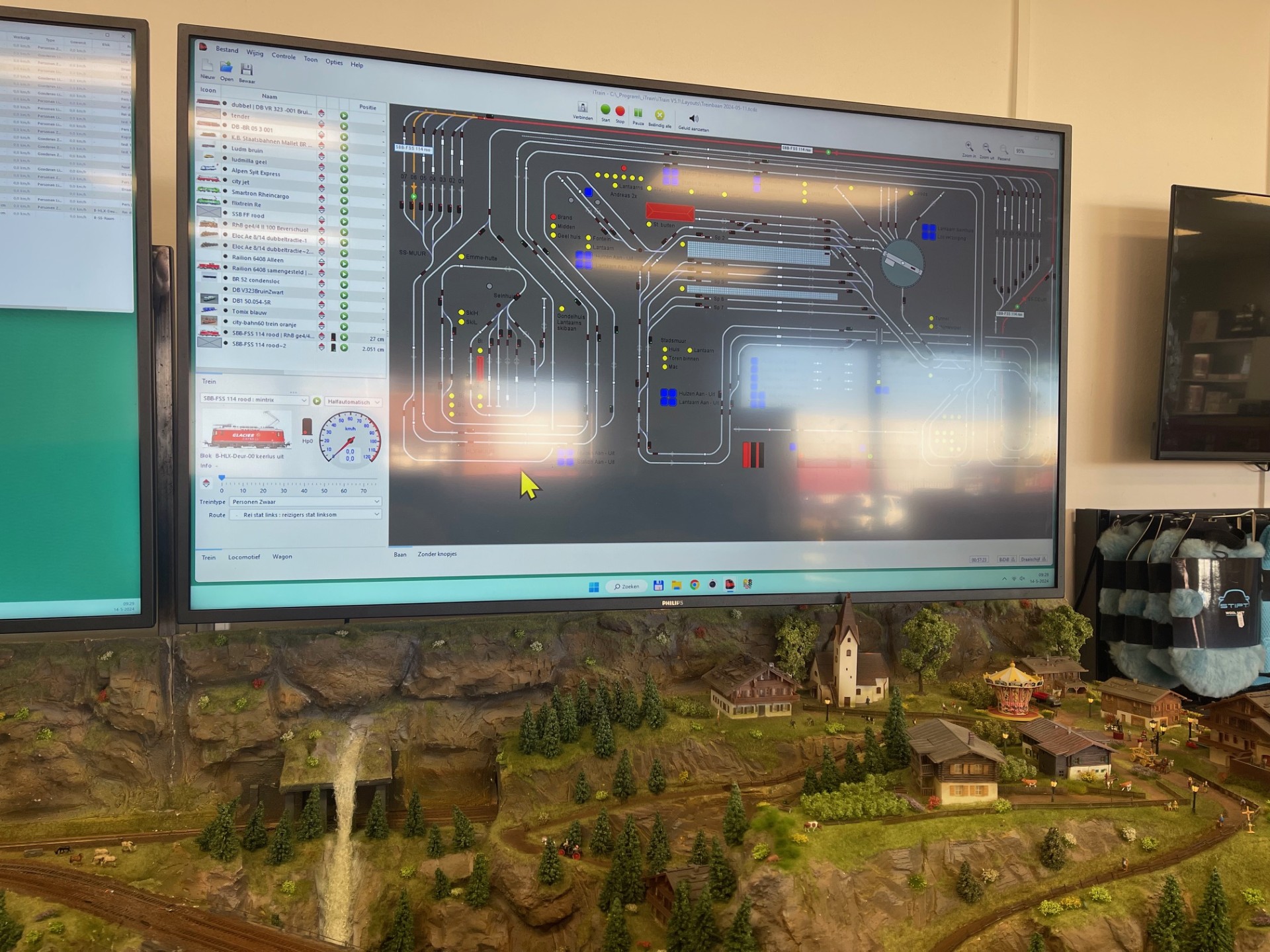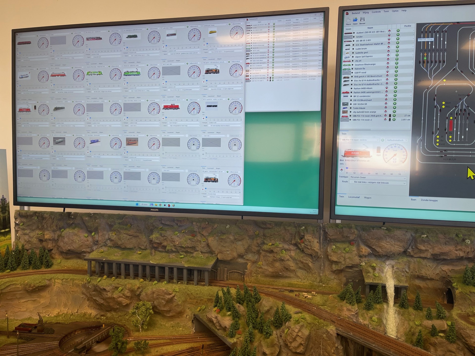 De modelbaan heeft een eigen computer en 2 grote 50 inch beeldschermen.